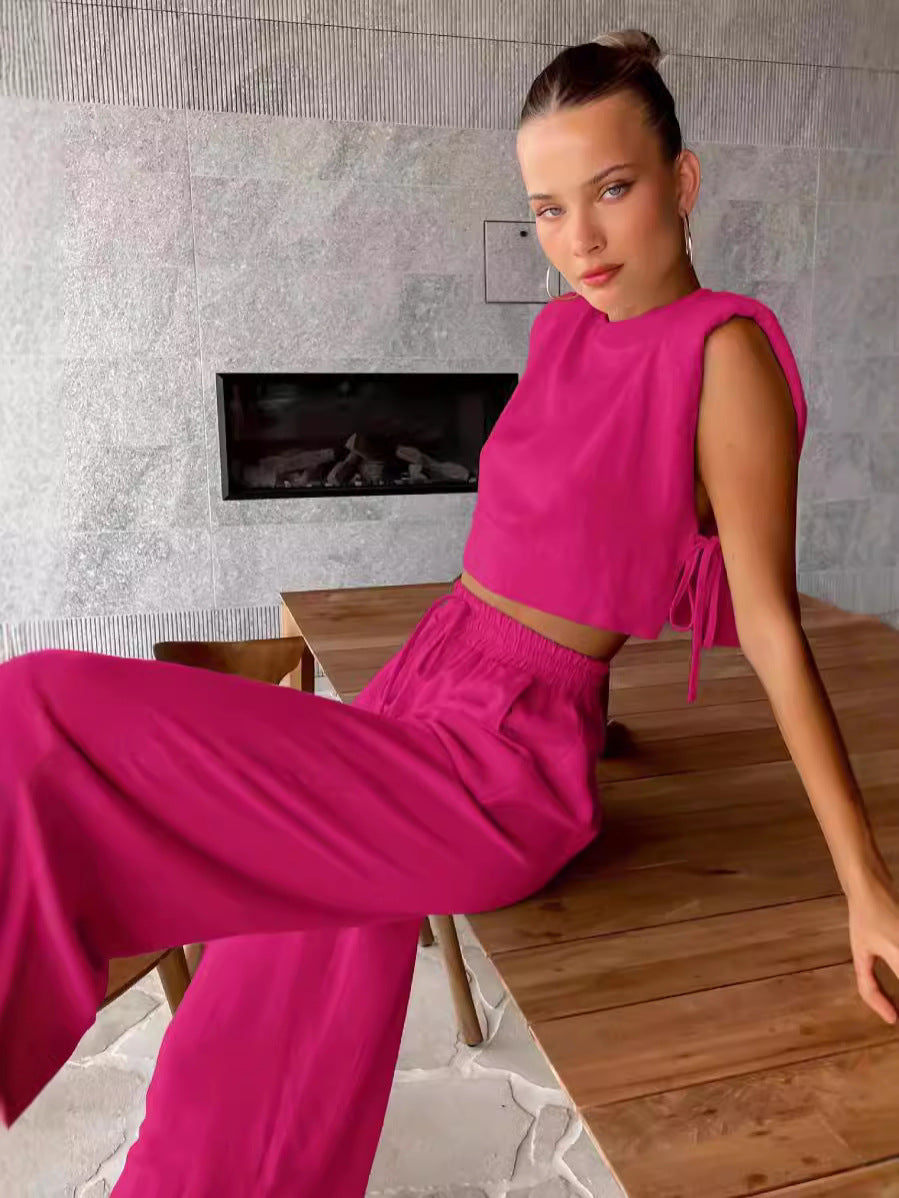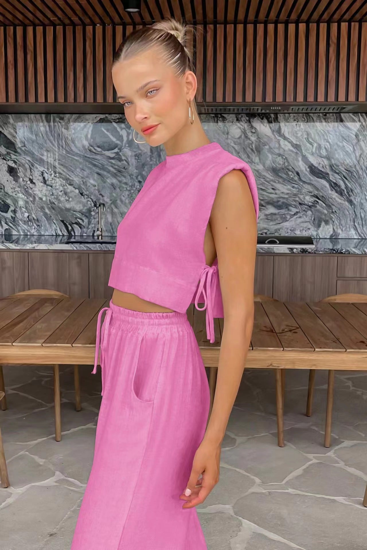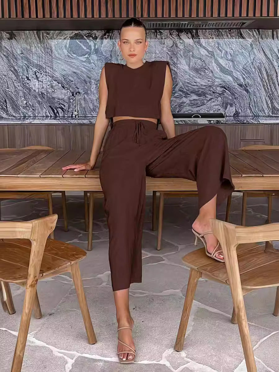 Moderne Struktur trifft auf atmungsaktiven Komfort. Das Evana-Set besteht aus einem taillierten, ärmellosen Oberteil mit dezenten Schulterpolstern und einer weiten Hose mit tiefen Taschen – alles aus einem leichten Baumwoll-Leinen-Mix gefertigt. Es ist eine mühelose Kombination aus Eleganz und Leichtigkeit, gemacht für warme Tage, die nach selbstbewusstem Stil verlangen.